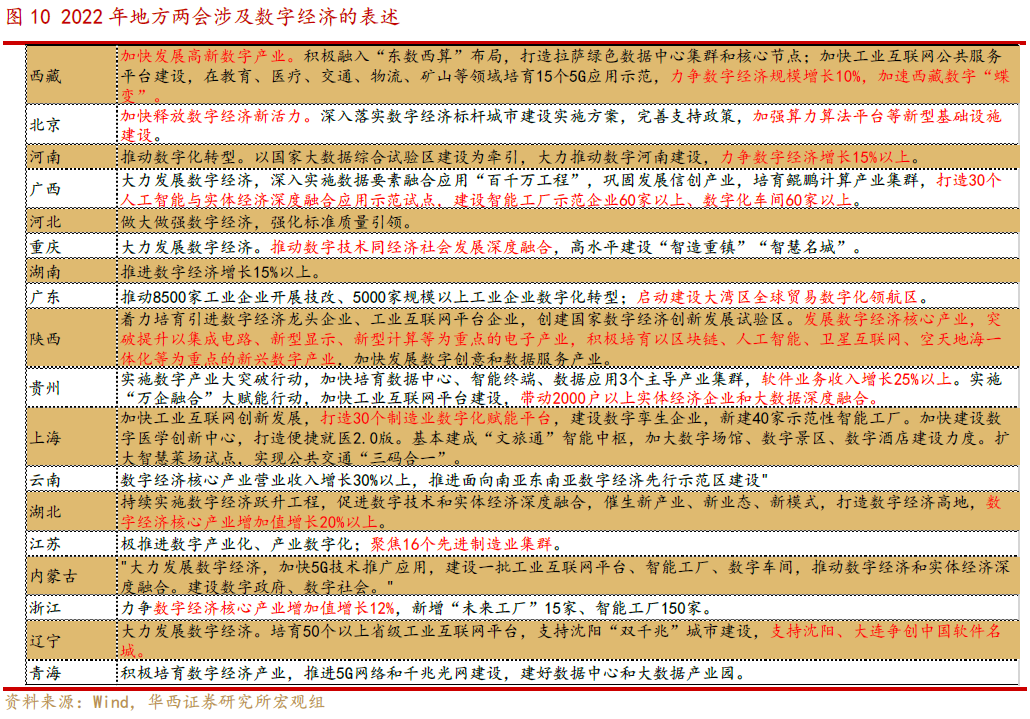 地方两会密集部署数字经济发展,多省提出具体发展目标,数字经济领域有望迎加速发展。例如:西藏提出力争数字经济规模增长10%;河南省提出力争数字经济增长15%以上;上海提出打造30个制造业数字化赋能平台,新建40家示范性智能工厂;浙江省提出数字经济核心产业增加值增长12%,湖北省提出数字经济核心产业增加值增长20%以上。