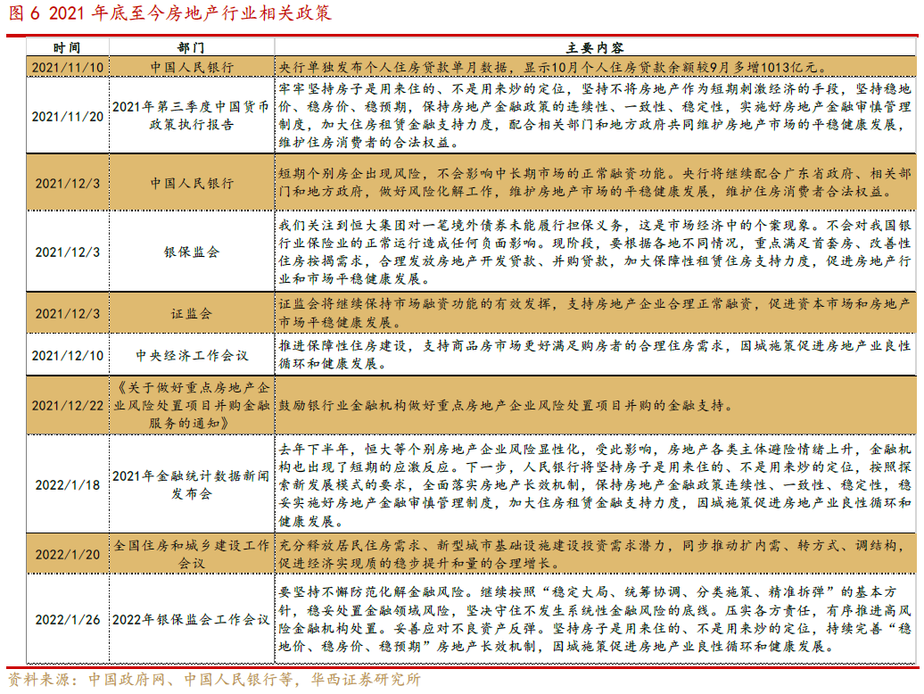 相比之前过严的地产政策,房地产政策已处于微调过程中。2021年12月中央经济工作会议中,继续坚持“房子是用来住的、不是用来炒的”定位。同时,与往期经济会议相比较,新增了“推进保障性住房建设,支持商品房市场更好满足购房者的合理住房需求,因城施策促进房地产业良性循环和健康发展。”