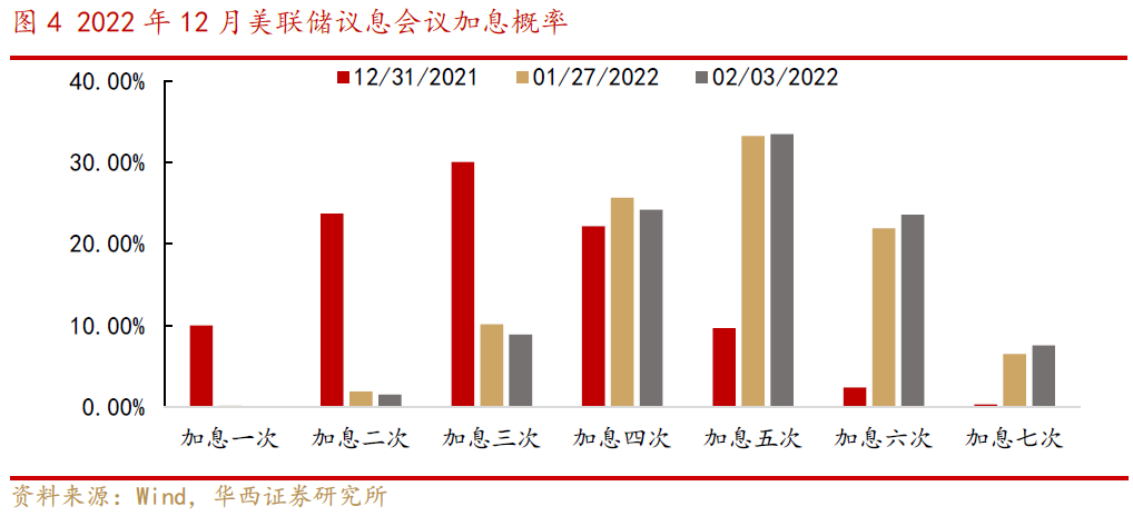 在美国通胀持续攀升、失业率处于低位的背景下,本轮美联储货币政策的收缩,可能前期的节奏会更快。从最新CME美联储观察来看,美联储1月议息会议声明发布后,市场对于年内加息4-6次已有充分预期,且加息7次(即在每次FOMC会议上都加息)的概率也在提升。