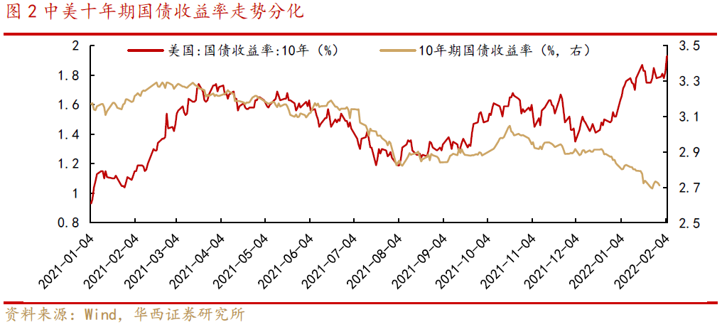 1)美联储货币政策向鹰派转向,市场对美联储加息预期升温,美债收益率上行导致风险资产波动加大,A股情绪面受海外股市扰动。一月份以来,美联储几乎统一了“鹰派”的立场,受此影响美股波动加大,年初以来(截至2/4)美股纳斯达克指数、标普500指数、道琼斯工业指数分别下跌了9.89%、5.57%、3.44%。美联储1月议息会议基调偏鹰,声明称:“由于通胀率远高于 2% 且劳动力市场强劲,委员会预计将很快上调联邦基金利率的目标区间。”鲍威尔在利率决议后的新闻发布会上表示,“鉴于通货膨胀加剧和劳动力市场强劲,美联储将继续调整政策,不排除在每次FOMC会议上都加息。”