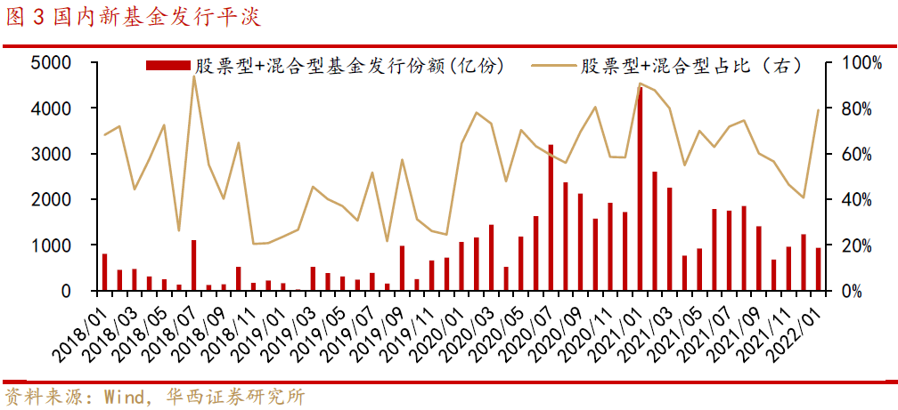 3)增量资金入市动力不足,A股整体呈现存量博弈。年末,国内部分热门的公募产品控制规模增长,停止或者限制了申购,导致A股资金面上“供需”出现了错位;基金发行方面,今年年初新基金发行较平淡,股票型+混合型基金发行941亿份,低于过去两年同期,显示部分场外资金尚在观望。
