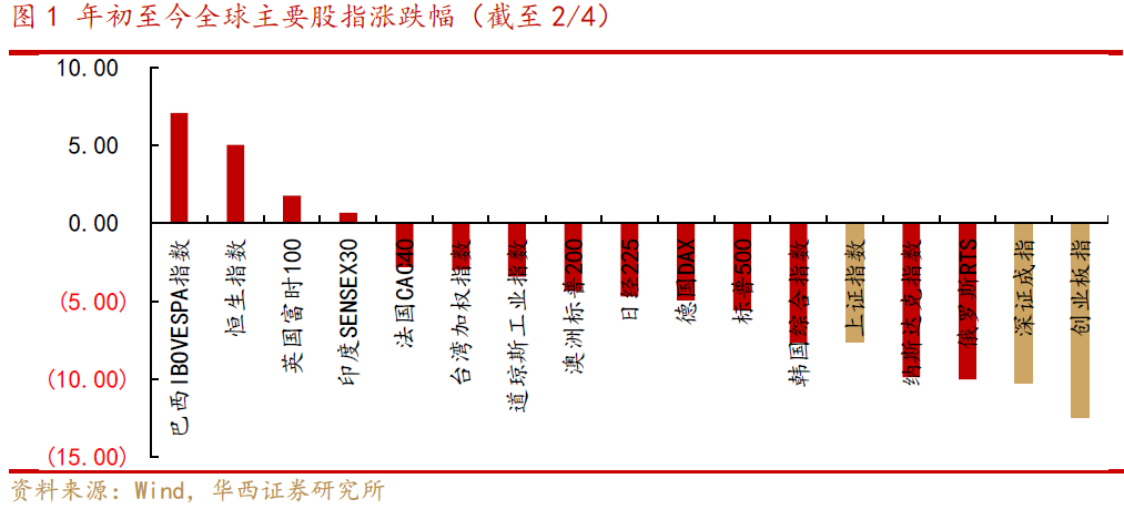 年初至今(截至2/4),A股走势较为疲软,上证指数、深证成指、创业板指区间涨跌幅分别为:-7.65%、-10.29%、-12.45%;军工、电力设备、医药、电子等赛道调整幅度较大。此轮A股市场调整下跌主要原因: