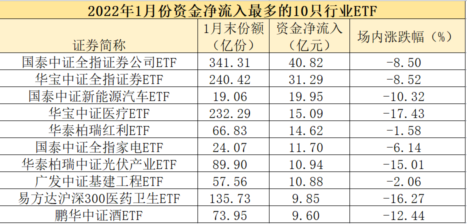 Wind统计显示,国泰中证全指证券公司ETF、华宝中证全指证券ETF在今年首月分别增加36.22亿份、28.95亿份,净流入资金分别为40.82亿元、31.29亿元,成为1月份最“吸金”的两只行业主题ETF。