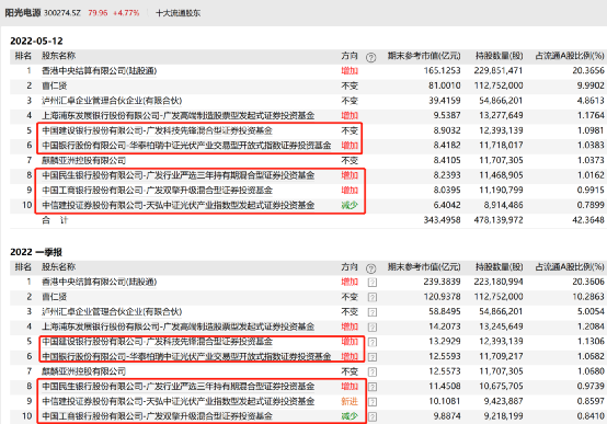 光伏新能源方面,截至5月12日,刘格菘管理的广发行业严选三年、郑澄然管理的广发高端制造二季度以来继续对阳光电源进行增持,同样由刘格菘管理的广发双擎升级则在一季度减持后,也转为增持操作,广发科技先锋则持股不变。此外,华泰柏瑞中证光伏产业ETF期间也进行了增持,天弘中证光伏产业则进行了减持。值得一提的是,基金一季报显示,阳光电源也是上述几只广发旗下基金的前十大重仓股。