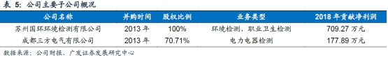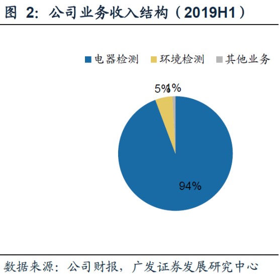 公司是目前我国电器检测条件最完备、检测能力最强、检测规模最大的第三方检测机构之一。从公司业务结构看,公司主要从事电器设备检测,同时在环境检测也有布局,2019年上半年电器检测和环境检测分别占公司总收入的94%和5%。