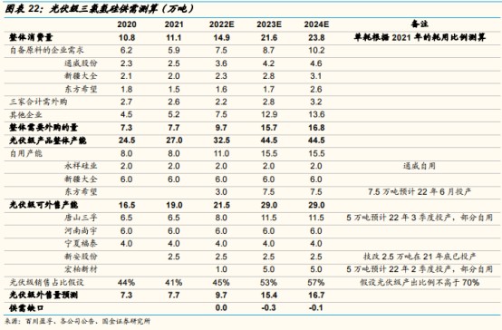 目前,可外售光伏级三氯氢硅的企业共有4家,合计可用于生产光伏级产品的产能19万吨。虽然今年有17.5万吨新增光伏级产能投放,但除掉自用生产部分可外售的供应增量有限,预计2022-2024年光伏级产品外售量分别为9.7、15.4、16.7万吨,行业供需缺口分别为0、-0.3、-0.1万吨。供需错配下行业高景气状态至少可延续到明年,具备光伏级产能的企业将持续受益。