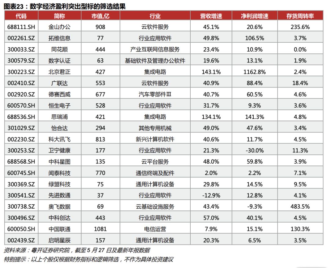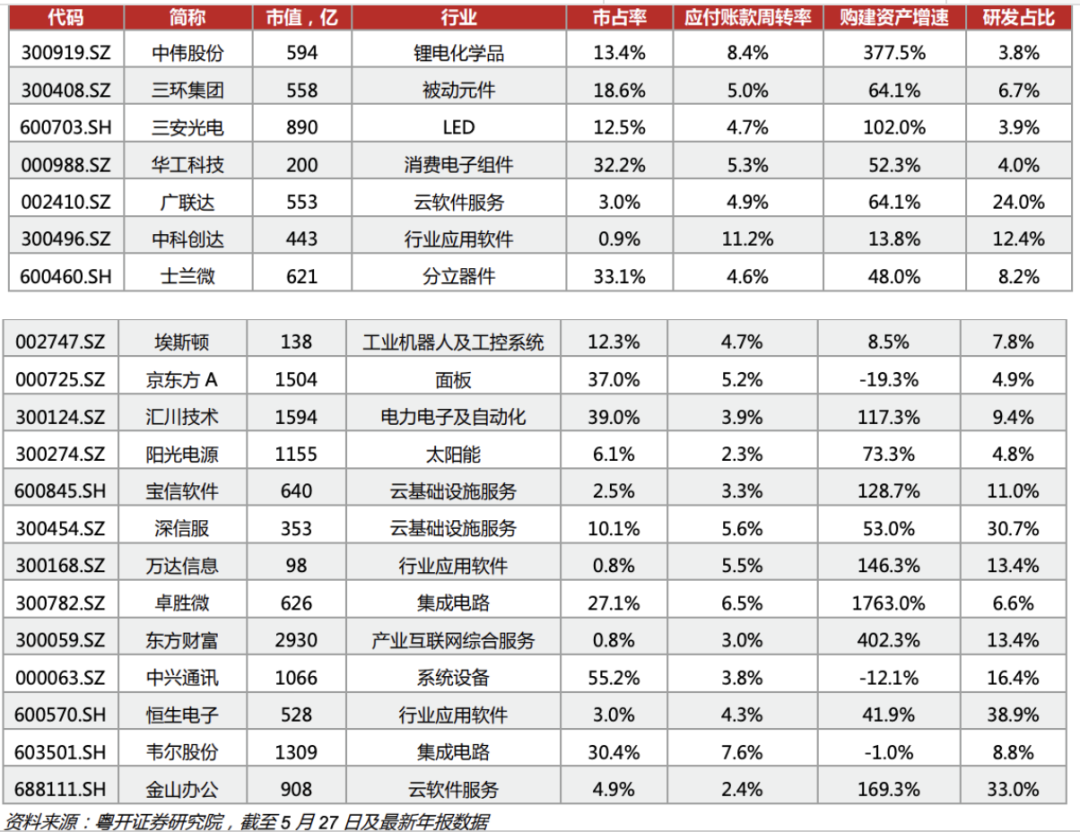 由于其涵盖行业广泛,分布在计算机、电子、通信、机械设备、国防军工、电力设备等多个差异较大的行业,公司所处生命周期、市值结构、市场表现等差异同样较大,因此,仍需我们进一步甄选,深度挖掘行业内的优秀公司。根据粤开证券研报,以策略的视角,我们选取行业内的数百只个股,从增长能力、竞争能力、盈利能力和资本市场关注度等四个层面设立十三个财务指标进行筛选,选股逻辑是:(1)增长能力优秀;(2)竞争能力强或持续提升;(3)盈利能力强或持续提升;(4)资本市场有一定关注度。