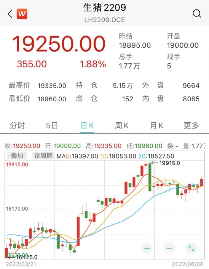 从猪期货来看,自4月中旬开始,便开启上涨行情,并在5月份涨至阶段新高。截至目前,生猪期货报19250元/吨,单日上涨1.88%,已经连涨5天。