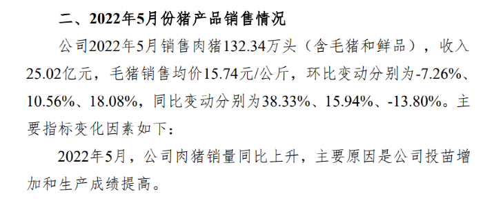 另外,温氏股份公告称,公司2022年5月销售肉猪132.34万头(含毛猪和鲜品),收入25.02亿元,毛猪销售均价15.74元/公斤,环比变动分别为-7.26%、10.56%、18.08%,同比变动分别为38.33%、15.94%、-13.80%。对此,温氏股份解释称,5月公司肉猪销量同比上升,主要原因是公司投苗增加和生产成绩提高。