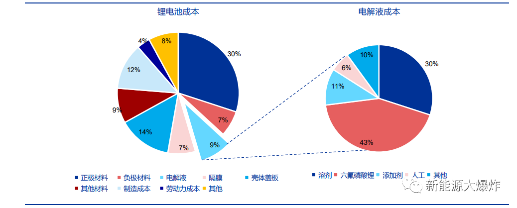 电解液的成本占比中:六氟磷酸锂的成本占比约为 43%,溶剂占比约 30%, 添加剂约占 11%,剩余的主要是人工及其他杂七杂八的费用,也就是电解液的原材料成本占比超过80% ,那么理论上来讲,对于电解液企业而言,谁的一体化做的越好,谁就有成本优势。