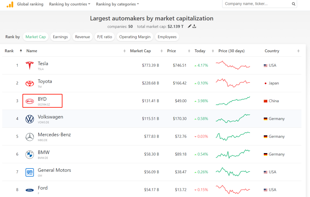 最近比亚迪市值离新高仅一步之遥,全球车企市值最新排行榜显示,比亚迪超过大众汽车集团,排位跃升至第三名。同时,比亚迪也是前10榜单中唯一的中国车企。