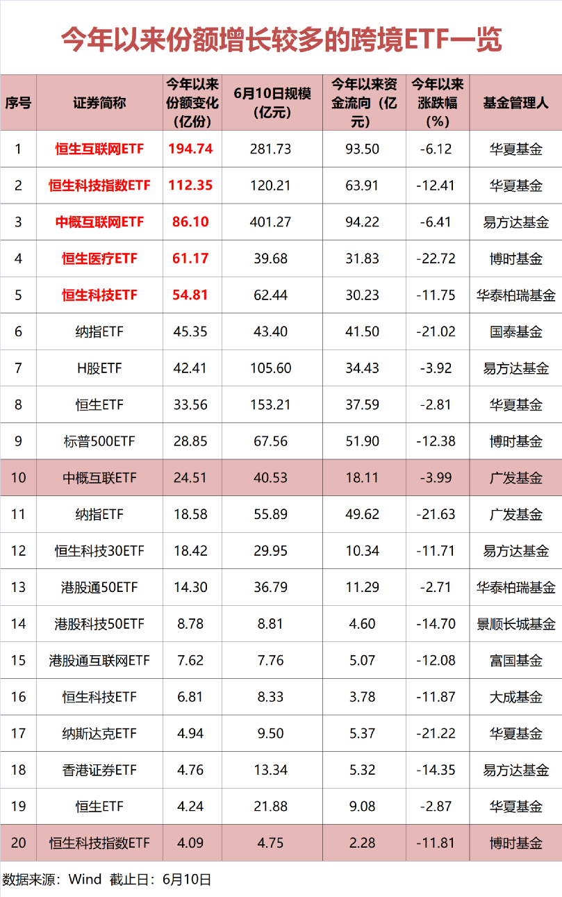 具体来看,目前68只跨境ETF中,今年以来份额增长较多的跨境ETF,大多为互联网科技主题,成分股包括阿里巴巴、美团、腾讯、快手、京东等个股。如今年以来增幅最多的恒生互联网ETF,其跟踪标的为香港恒生互联网科技业指数,截至6月10日,该基金亏损6.12%,但基金份额达525.03亿份,相较于去年底基金份额猛增194.74亿份。