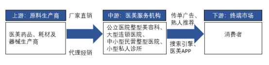 医疗美容这个行业有上游提供医美药品、器材的公司等;中游是各个医美服务机构,就是“动刀子”或者问诊的地方;下游就是为上面哪些公司提供引流、推广的互联网平台。