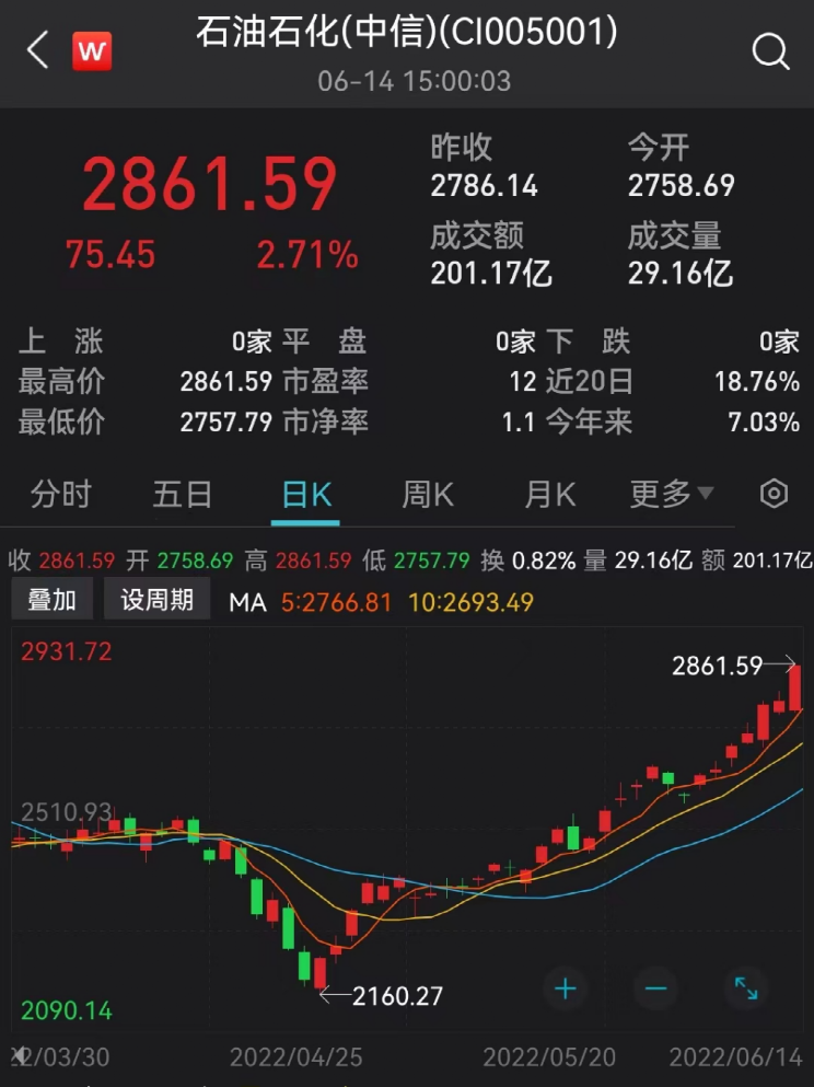 自4月27日以来,石油板块呈现连续上涨趋势,从最低点2160点位涨至2861点位。今日,石油石化行业上涨2.93%,表现较好。