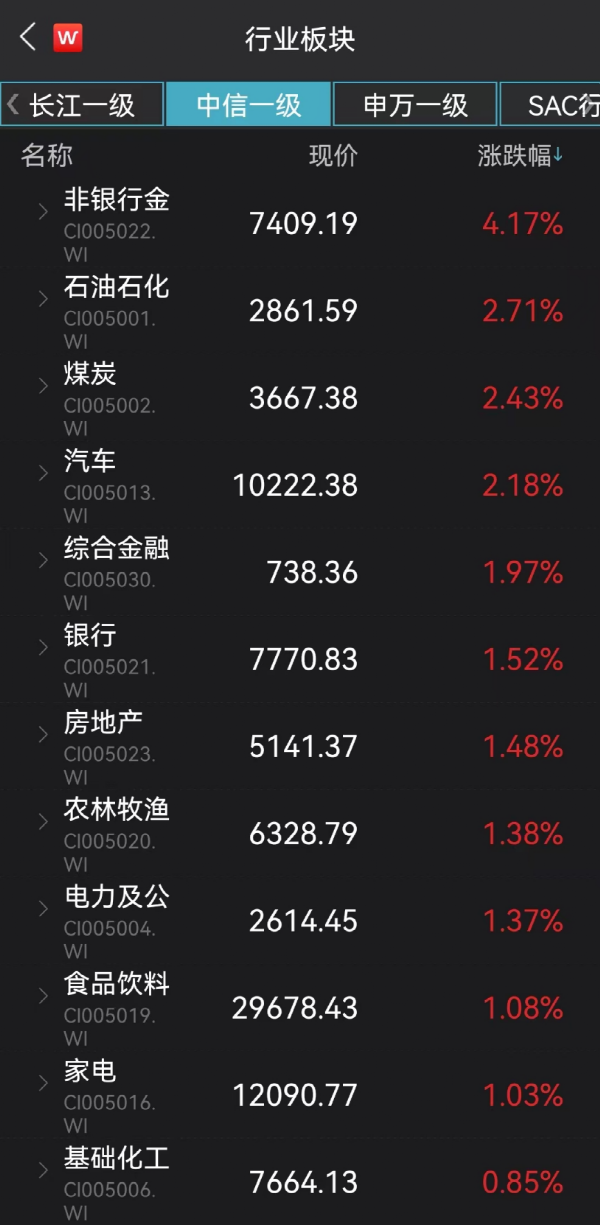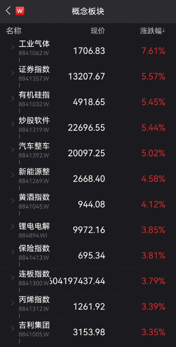 从概念板块来看,多个指数表现超预期:工业气体指数涨幅超7%,证券指数涨超5.5%。