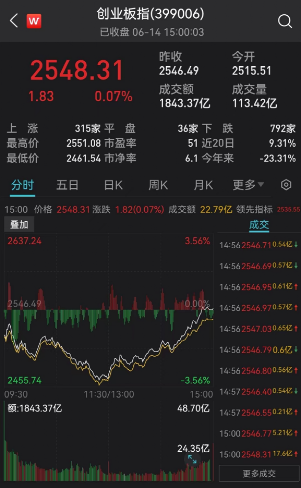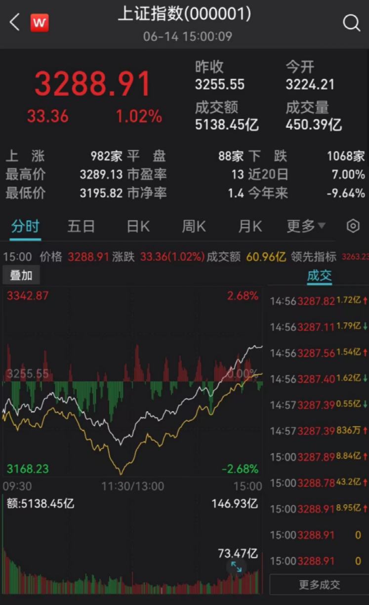 6月14日,隔夜美股大跌,大盘早盘受到影响而低开,上证指数、深证成指、创业板指在中午收市时,跌幅普遍在2%左右。然后在午后三大指数震荡上行。数据显示,上证指数、深证成指、创业板指均以红盘收市,分别上涨1.02%、0.20%、0.07%。