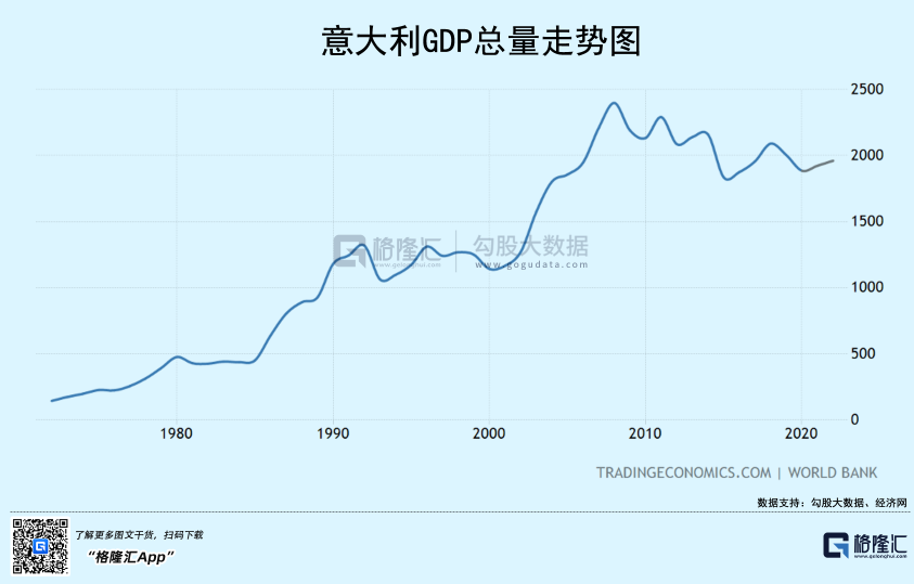 另一方面,意大利的经济要死不活,明显弱于欧元区整体表现。2008年,意大利GDP总量为历史最高值,为2.4万亿美元,到2021年却萎缩至2.11万亿美元,13年锐减2900亿美元。