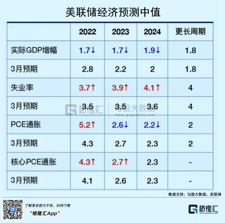 对于PCE通胀,联储预测中值2022-2024年分别为5.2%、2.6%、2.2%,较3月分别上调0.9%、-0.1%、-0.1%。PCE与CPI的统计口径有些不一样,但大体趋势相同。这也意味着美联储认为今年到年末通胀会至少维持在5.2%以上。同期,美联储将经济增速再度大幅下调至1.7%,较3月增速足足砍掉了40%。