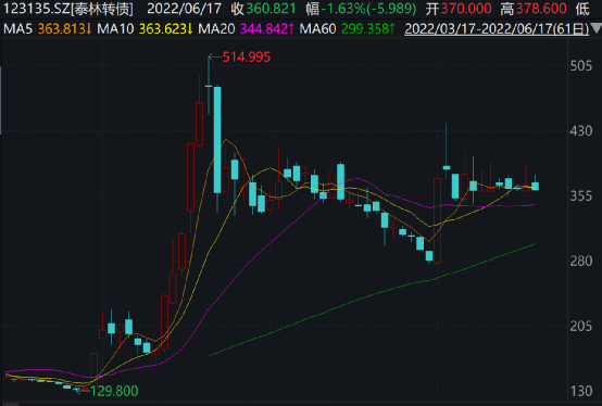 另外,泰林转债6月1日也大涨34.22%,报收375元。6月2日,深交所表示,当周对异常波动的“泰林转债”进行了重点监控。