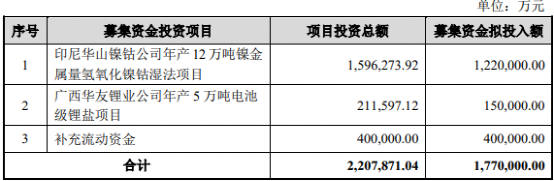 在此背景下,华友钴业采取了股权融资这一路径,其抛出了高达177亿元的巨额定增方案,发行对象为公司控股股东华友控股以及不超过34名特定对象。而定增的募投项目为上述三个投资项目中的两个:华山镍钴年产12万吨镍金属量氢氧化镍钴湿法项目、华友锂业年产5万吨电池级锂盐项目。同时补充流动资金40亿元。