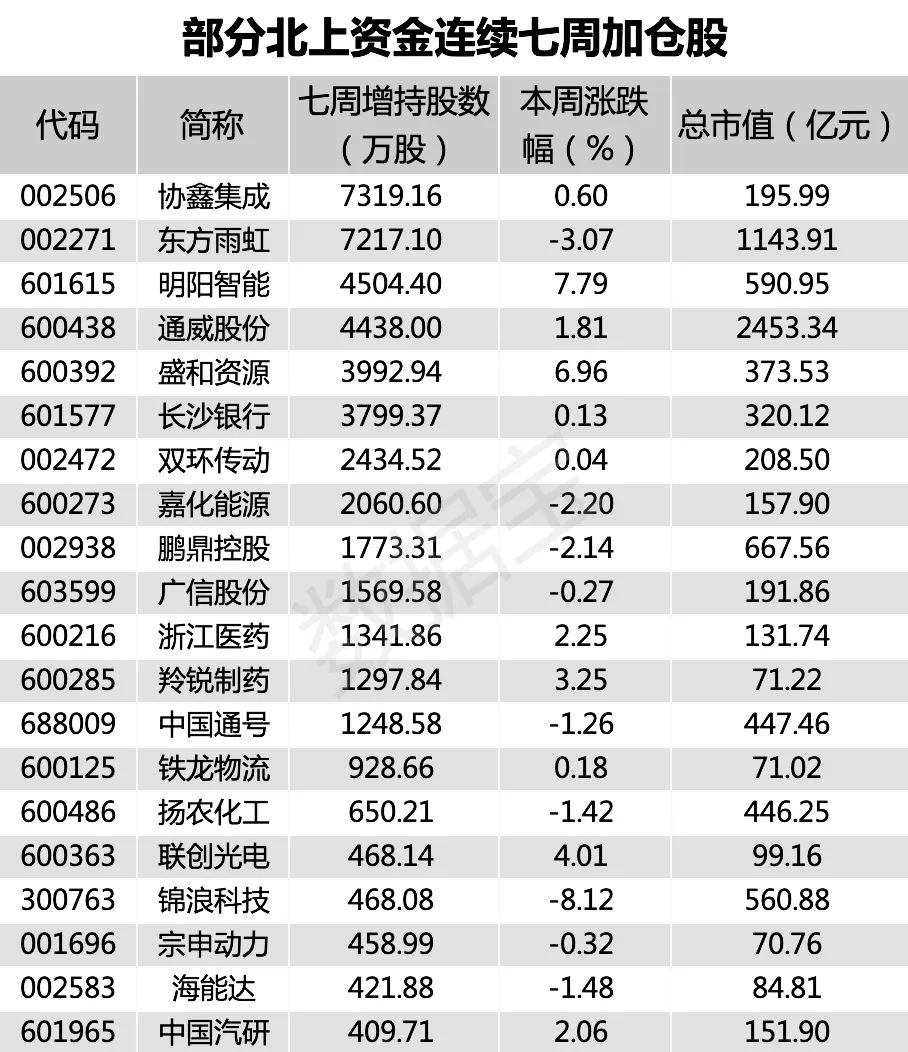 从连续性看,据数据统计,29股获北上资金连续七周加仓,集中在新能源、化工、医药板块。从持股量增长来看,协鑫集成、东方雨虹增持股数最多,均在7000万股以上。上周部分北上资金连续加仓股表现出色,一周平均上涨1.24%;电力设备股表现最好,迈为股份、明阳智能周涨幅均超过7%,获北上资金长期加仓。