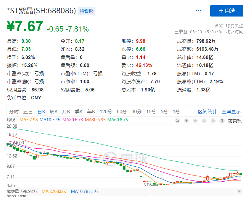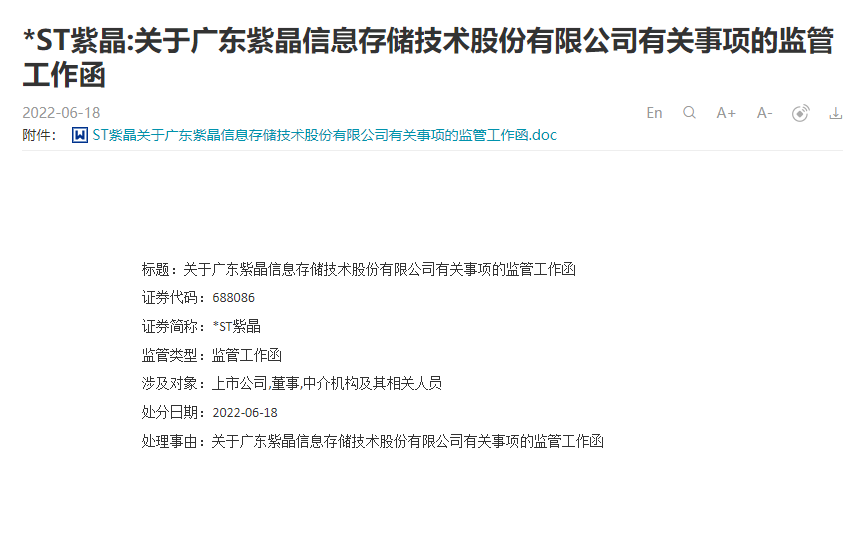 根据上交所科创板网站披露,6月18日,上交所对*ST紫晶下发监管工作函。