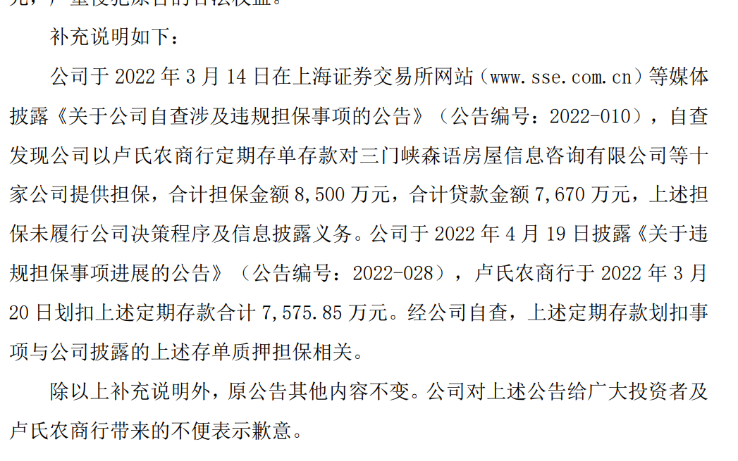 补充公告称自查发现公司以卢氏农商行定期存单存款对三门峡森语房屋信息咨询有限公司等十家公司提供担保,合计担保金额8500万元,合计贷款金额7670万元,上述担保未履行公司决策程序及信息披露义务。