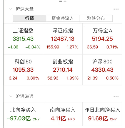 三大指数全天走势分化,上证指数围绕平盘附近震荡,创业板指高开后震荡走高。截至收盘,沪指微跌0.04%报3315.43点,深成指涨1.27%报12487.13点,创业板指涨1.99%报2710.14点;两市合计成交11645元,北向资金净卖出97.03亿元。