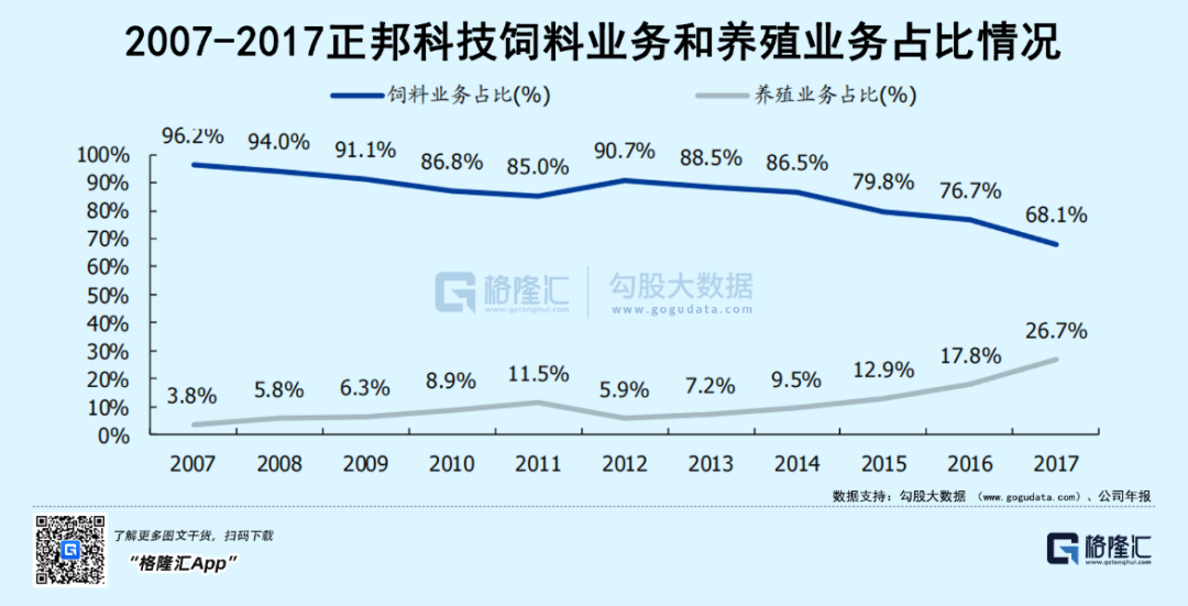 到2017年,饲料业务的占比仍然有68.1%,养殖业务占比则提升至26.7%,从毛利构成来看,饲料业务贡献13.01 亿元,占比 54.3%;养殖业务则贡献7.94 亿元,占比 33.1%,养殖业务的利润贡献度还要略微高于传统的饲料业务。