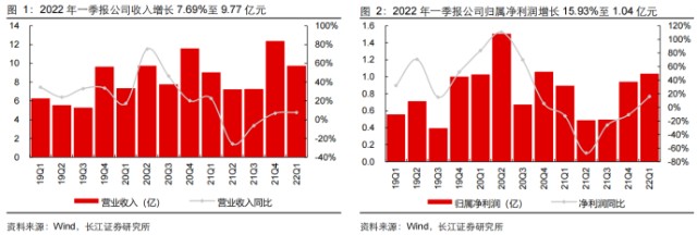 然后今年一季度公司收入继续恢复性增长,经营改善也比较明显。1Q22 公司实现营收9.77 亿元,同比+7.69%,增速较21Q4 环比提升0.86pct,增速于21Q4 转正后进一步加速,复苏态势明显。