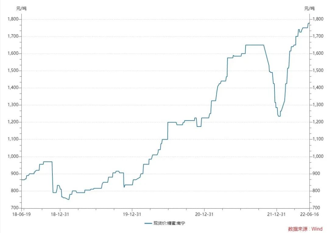 今年上半年糖蜜价格高位上涨。据Wind数据,截至6月16日,南宁糖蜜现货价1780元/吨,较今年初上涨38.52%,与去年同期相比上涨12.3%。