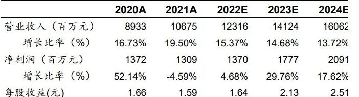 2021 年,公司实现营收 106.07 亿元, 同比增 19.39 %;实现归母净利润13.09 亿元,同比降 4.59 %,2021 年公司的综合毛利率为 27.34 %,较上年下降 6.66 个百分点。