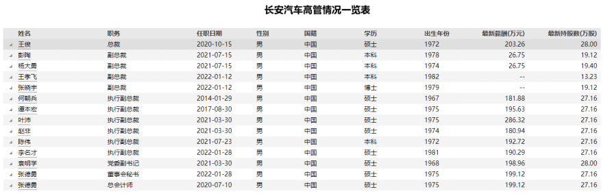朱华荣时代最直观的体现就是干部年轻化。2020年新上任的总裁王俊今年50岁,2022年已经有两名80后升任高管,其中副总裁王孝飞生于1982年,今年刚满40岁,执行副总裁李名才生于1981年,41岁,对于长安汽车这种老国企来说,四十岁升任副总裁,是非常不常见和极其有魄力的。