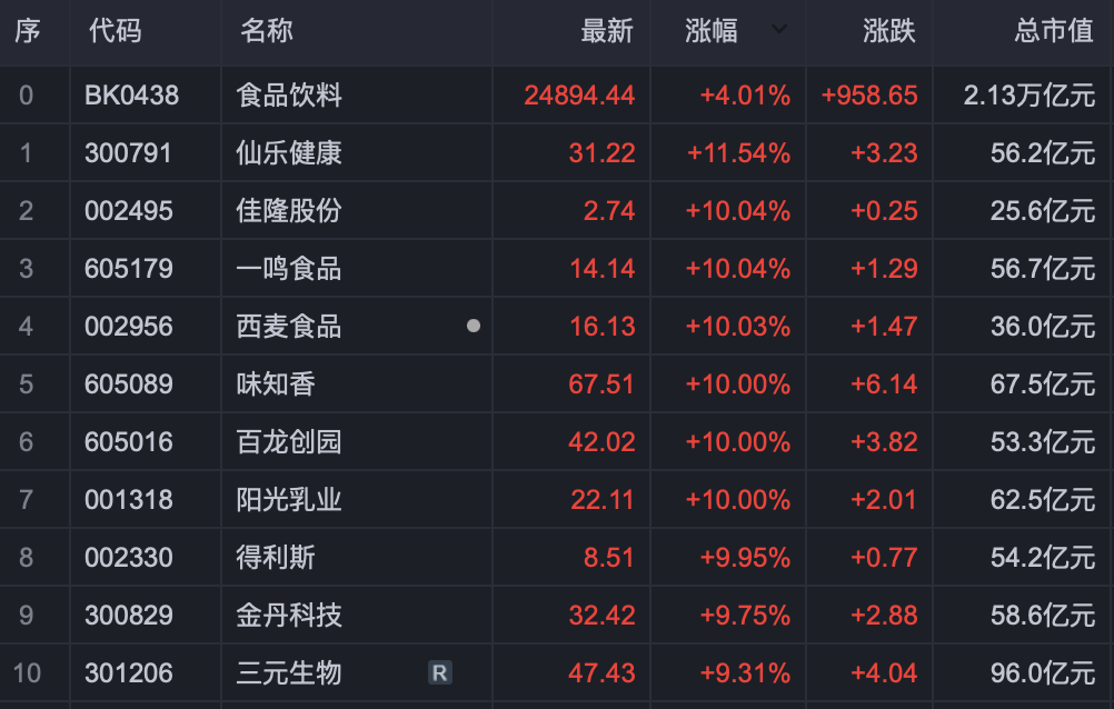 食品饮料行业股票涨幅榜: