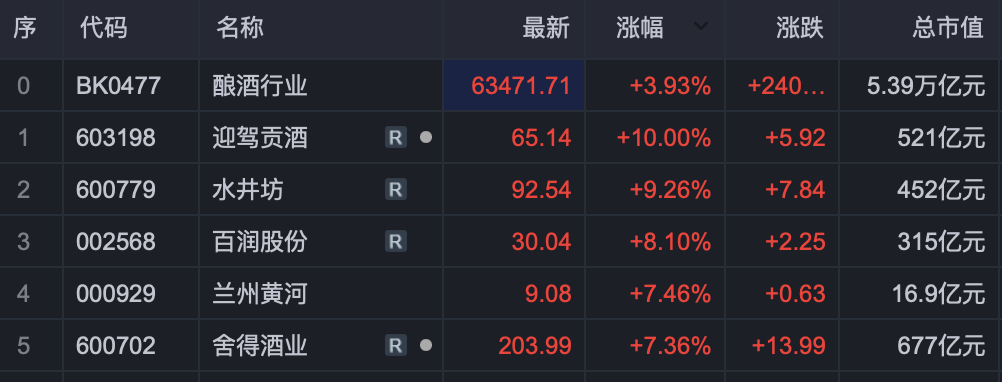 酿酒行业股票涨幅榜: