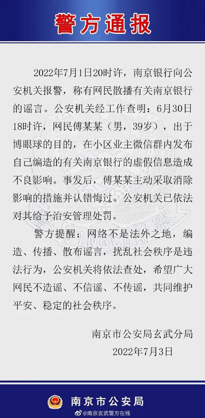 7月3日,南京市公安局玄武分局通报称,7月1日20时许,南京银行向公安机关报警,称有网民散播有关南京银行的谣言。