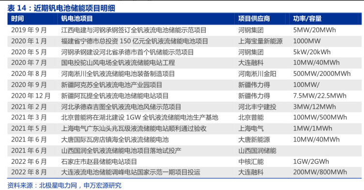 从行业具体项目来看,自2019年以来,多个钒电池储能项目已纷纷落地或即将提上日程,其中最近的为2022年8月将投运的大连液流电池储能调峰电站国家示范一期项目。