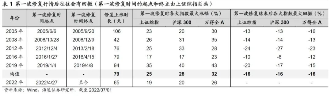 对比过去5次熊市见底后的第一波修复行情,以上证综指为例,指数上涨的平均持续时长为79天,第一波修复时的最大涨幅平均为25%(沪深300平均涨28%、万得全A平均涨32%),而第一波修复行情走完后上证综指最大回撤平均为16%(沪深300、万得全A平均最大回撤均为16%)。