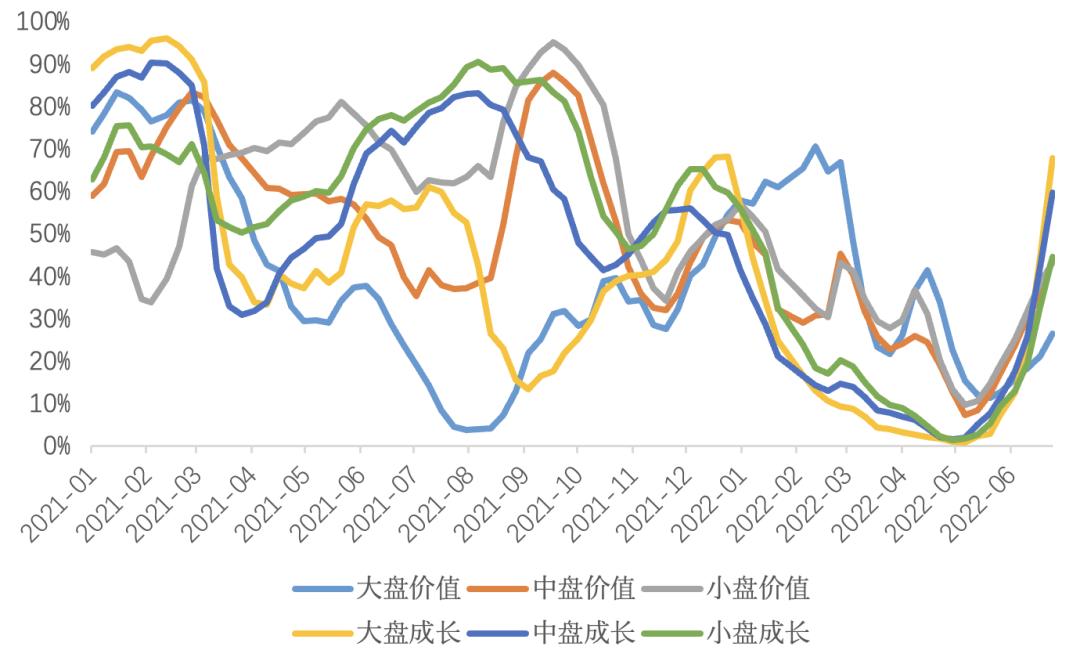 对比大/中/小盘价值/成长六个风格指数,大盘成长、中盘成长的交易拥挤度都在中性上方(60%分位),中盘价值、小盘价值和小盘成长目前交易拥挤度仍略低于中性(44%、43%和45%),大盘价值的交易拥挤度修复最慢,目前处在27%的较低位置。