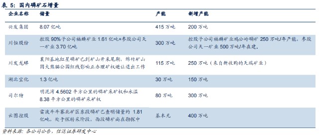投资机会方面,建议投资者关注有磷矿石资源且有增量的公司,如兴发集团,川恒股份、川发龙蟒等。其中,兴发集团是国内磷矿龙头,拥有磷矿石储量8.07亿吨,产能415万吨,规划新增产能200万吨。