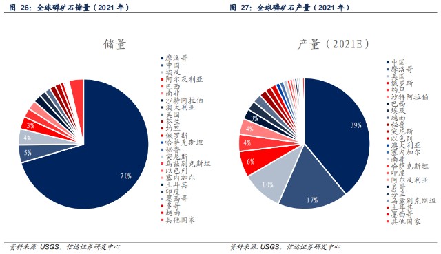 供给端,磷矿石是一种不可再生资源,不同国家之间差异显著。2021年全球磷矿石总储量710亿吨,主要集中在摩洛哥和西撒哈拉、中国、阿尔及利亚、叙利亚等十个国家。其中70%的磷矿分布在摩洛哥。我国磷矿石储量32亿吨,居全球第二,产量分布也较为集中,2021年产量约8500万吨,占全球总产量的39.06%,用途上多内销自用。伴随我国环保政策趋严、未来磷矿石供给局面仍然趋紧。资源有限的情况下,不排除从海外进口更多的磷矿石产品。