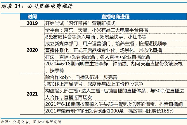 研报菌简评:2021年公司在与kol合作的基础上进一步完善强化自播队伍,并针对线上增加产品型号,系统的构建起“头部主播+达人主播+店铺自播”的体系。