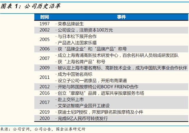 公司为按摩椅龙头企业,2005年尝试拓展海外市场,尝试与松下以ODM模式合作。在产品力先行的思路下公司2007年成立研发中心,聚焦产品创新。2011年以后开始注重电商渠道、品牌矩阵、以及长期稳定的大客户的开发与维系,2017年IPO后启动扩产,前期布局迎来收获。