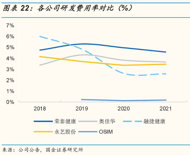 公司研发保持高投入,研发费用率位居行业前列。2021年公司研发投入为1.2亿元,占营收比重为4.6%,在行业可比公司中最高,奥佳华、融捷健康、永艺股份,分别为3.7%、2.6%、3.4%,外资龙头OSIM研发费用率仅为0.18%。