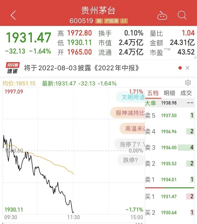 A股之王,白酒的绝对大哥贵州茅台也下跌1.64%。