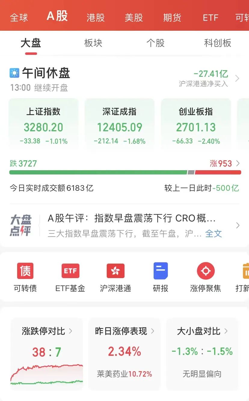 新能源车、半导体、医疗医药等赛道都还在往下走,上午跌幅领先,市场大势也不好。上午收盘,上证指数跌1.01%,深证成指跌1.68%,创业板指数大跌2.4%,科创50指数大跌2.52%,成交额6183亿元。