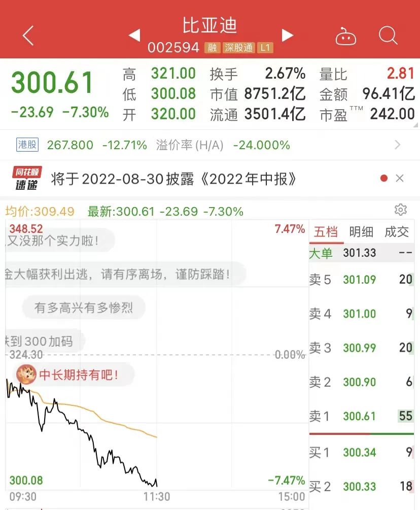 一则重磅传闻来袭,引发是否股神巴菲特抛售猜想。昨天还9000多亿市值的比亚迪,今早开盘后突然大幅跳水,上午收盘A股重挫7.3%,H股上午盘中跌超13%。昨天锂矿重磅股票天齐锂业突发跌停,徐翔妻子发文直言该股估值高了。
