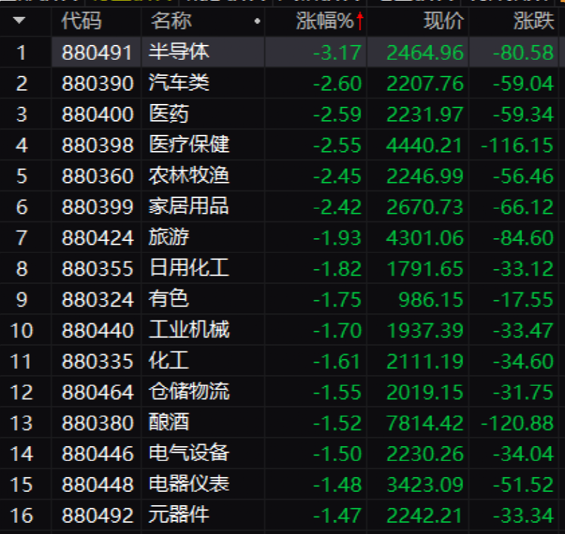半导体、汽车(新能源)、医疗医药等赛道纷纷下跌,板块跌幅靠前。