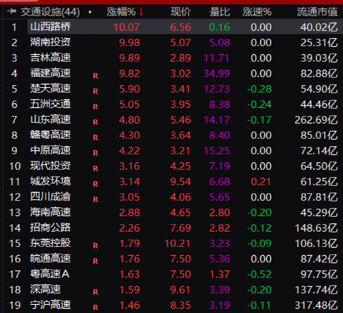 过去很少表现的高速公路股突然发飙,多只直冲涨停。建筑、电力、银行等板块也逆势抗跌飘红。