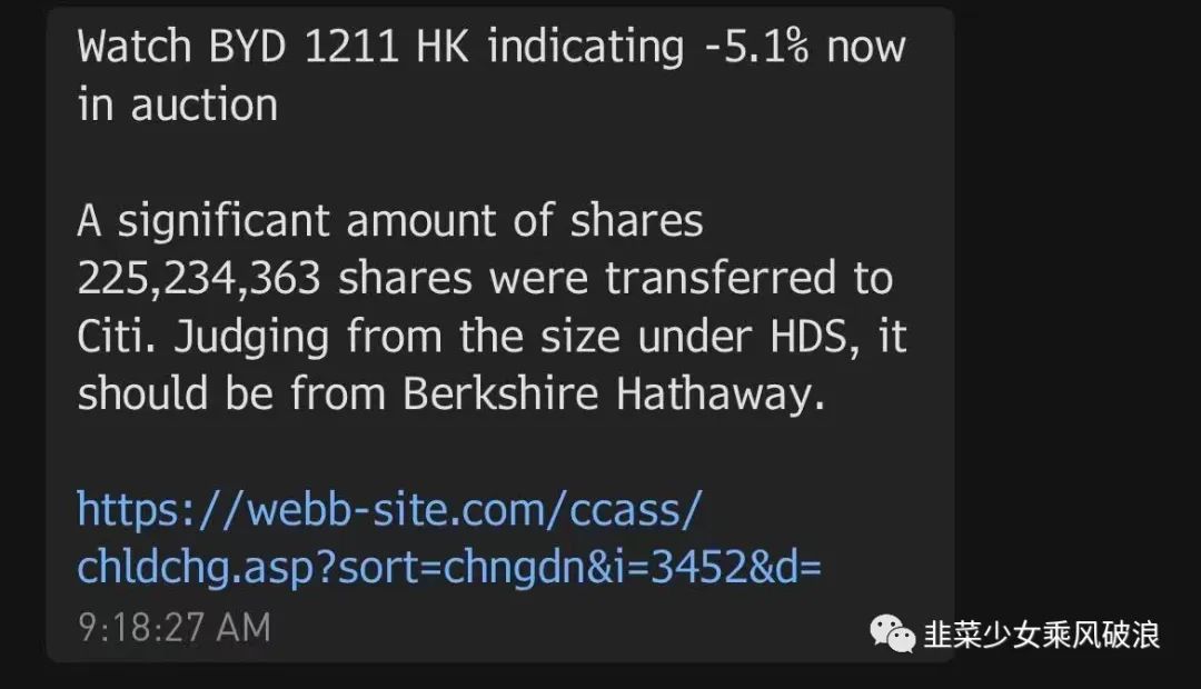 再来说说比亚迪,今天比亚迪大跌,港股比亚迪股份更是跌了10%,市场传闻巴菲特“跑路了”:比亚迪股份2.25亿股于7月11日被转让给花旗银行。市场人士从转让规模猜测,这些股份应该是来自巴菲特旗下的伯克希尔哈撒韦。